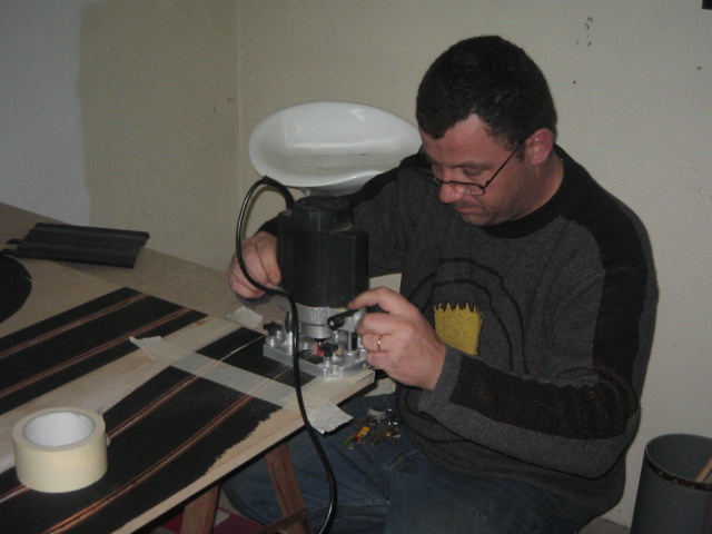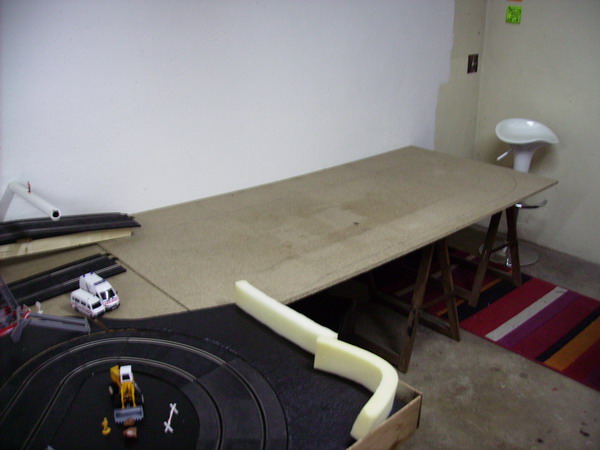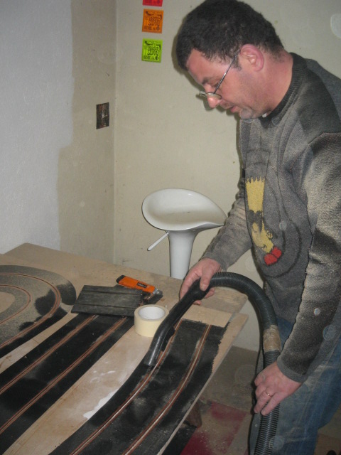 9h40, on entame la défonce du plateau qui accueillera le demi rail ninco sacrifié pour l'occasion (dieu ait son âme) qui assurera la liaison entre la partie bois et la partie plastique.