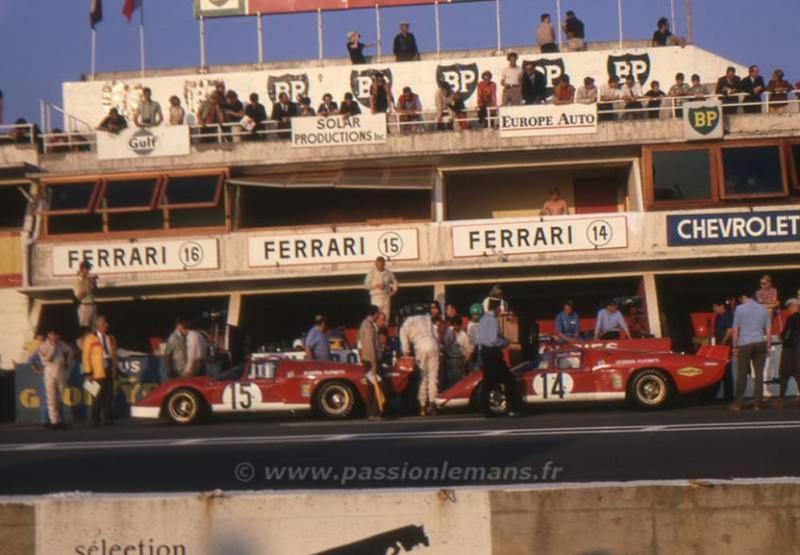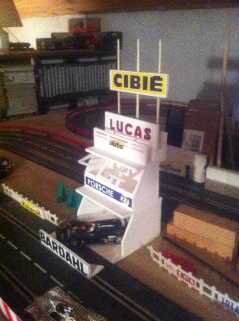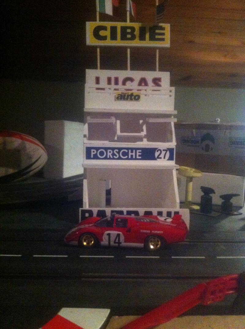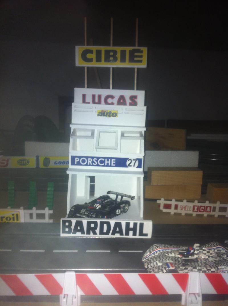 Je vous envoie le premier cliché de ma première déco (désolé, la photo n'est pas de bonne qualité). J'ai pris modèle sur les stands du mans de 1970 (comme beaucoup...), Réalisé sans plan , "abisto denas" comme on dit ici dans le sud ouest ,avec du carton plume.