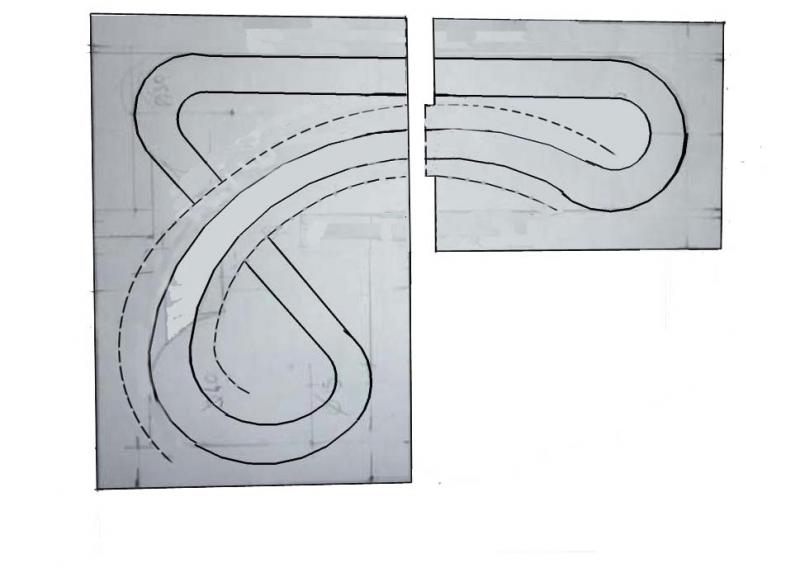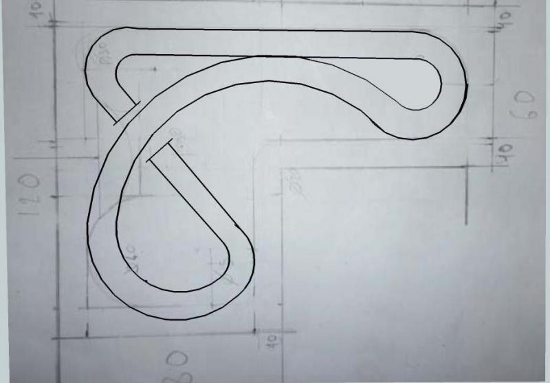 En admettant que tu imagines un tracé dans le même genre que le mien, voici la procédure à suivre. Je vais te faire un ou deux plans supplémentaires. Bien sûr, tu rectifieras légèrement le rayon de la parabolique qui passe trop près de la ligne droite. J'ai repris rapidemnt le dessin à main levé ce n'est donc pas très précis mais compréhensif.