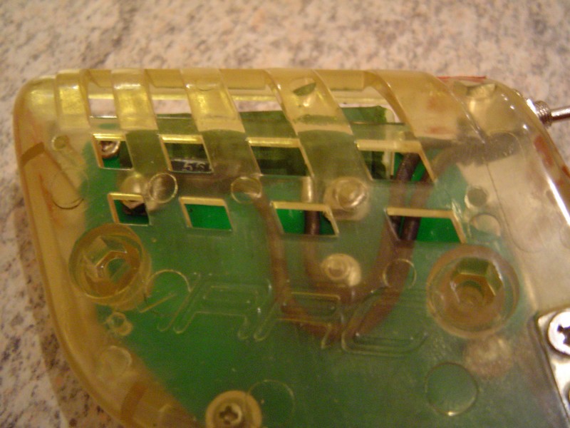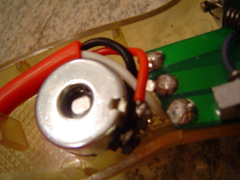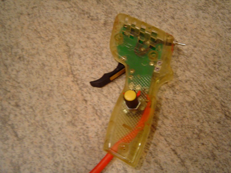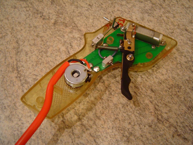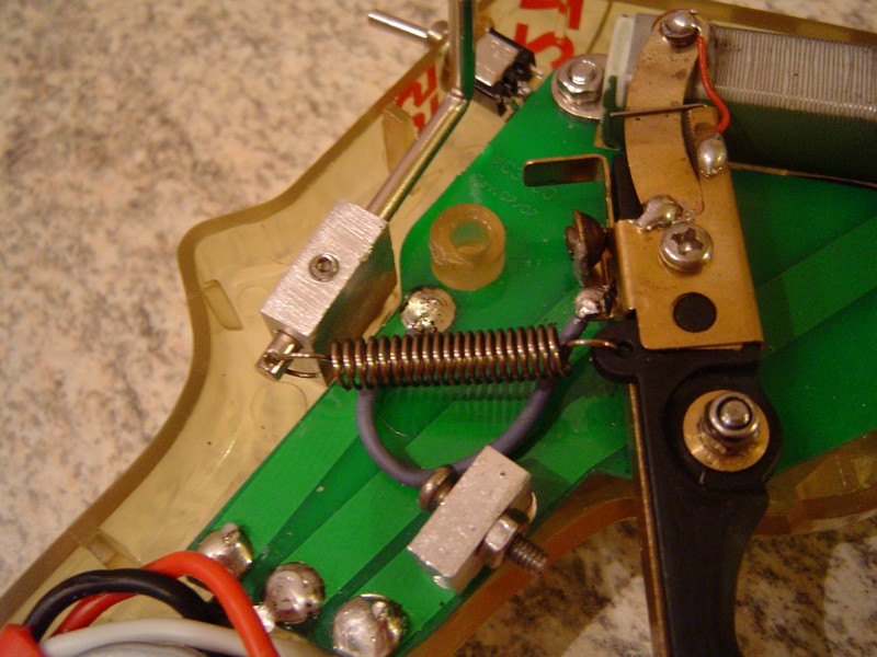 Le fil de contact entre la gachette et la platine epoxy a du être remplacé car celui d'origine a laché. 2 points de soudure ont été rajouté mais ne sont pas indispensable. La gachette 2 doigts a pris place au lieu du modèle simple d'origine. Une butée permets de limiter le débattement maximun de la gachette. La buté d'arrêt est aussi un contact électrique. La tension ressort est règlable ce qui est très confortable. La résistance est vissé sur la platine epoxy. Ce système garantie une bonne fiabilité. Un petit ressort au niveau du contact permets d'assurer un 100% contact gachette résistance. La gachette est sur palié!