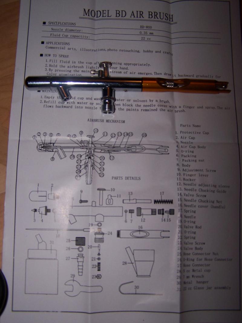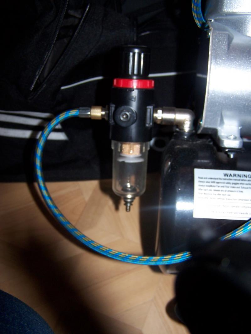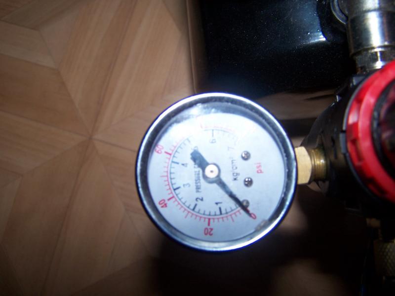 Alors je branche le compresseur, il monte en pression, je branche l'aéro dessus , je règle la pression à 2 bars (j'ai une buse de 0.3).