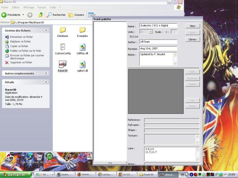 | le soucis ces que dessus j'avais fait le circuit que je comptait faire en définitifs bah peux as le lire pour la ref des rails tu peut toujours sauvegarder le circuit, pour l'instant ! non ? . Auteur Message scasid91 Genre : Masculin Masculin Inscription : 19/09/2005 Date du message : mercredi 30 juillet 2008 à 17h32 je l'est retelecharger et réinstalle vais voir pour trouvé une version inférieur peux être que ça passera merci quand meme de t'etre penché dessus toujours le 1er en course en partant de la fin !! Auteur Message VO2max Genre : Masculin Masculin Inscription : 19/02/2007 Date du message : mercredi 30 juillet 2008 à 18h33 Peux pas t'aider !!! Pose lui ta question (il est français...de haute savoie) sur ce forum Bonne chance. VO2max - Castor junior Auteur Message scasid91 Genre : Masculin Masculin Inscription : 19/09/2005 Date du message : mercredi 30 juillet 2008 à 18h57 hello VOmax j'ai étais sur le forum de folm via le site de ur et j'ai trouvé la solution il fallait supprimé le fichier racer.ini dans c:/windows ces cool tous refonctionne merci a vous pour vous y êtes intéressés toujours le 1er en course en partant de la fin !! Auteur Message Teubarland Date du message : jeudi 31 juillet 2008 à 08h44 Haaaaaaaaaaaaaaaaaaaaaaaaaaaaaaaaaaaaaaaaaaaaaaaaaa !!!! bin voila ! cool !!!! gazzzzzzzz a donf alors !!!! . |