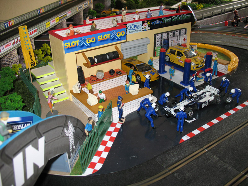 Et puis j'ai acheté un stand Scalex. (j'ai peint les "bonsommes") et je me suis dit que j'allais faire toutes les autres déco. moi même avec des bâtiments qui n'existent pas mais qui iraient bien avec mon circuit.Voilou!!, et la réaction des gens: oua super ta déco...et après.... c'est que la course qui compte!!!