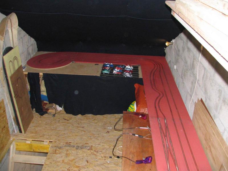 Sa fait un peu plus d'un an que j'ai déménagé dans petit pavillon mais il n'y avait aucun endroit pour installer une piste J'ai donc monté un plancher au dessus du garage pour me faire un grenier, bon 6m sur 2m50 sa fait pas très grand mais bon on fait avec se que l'on as
