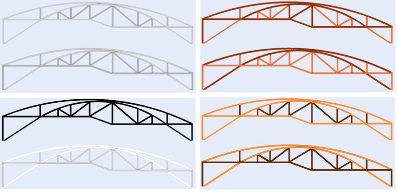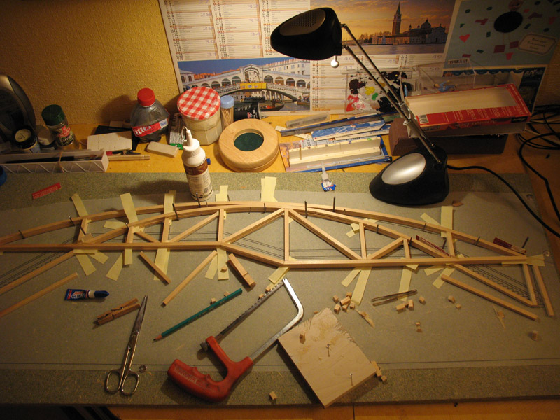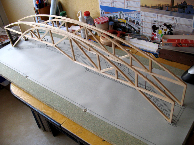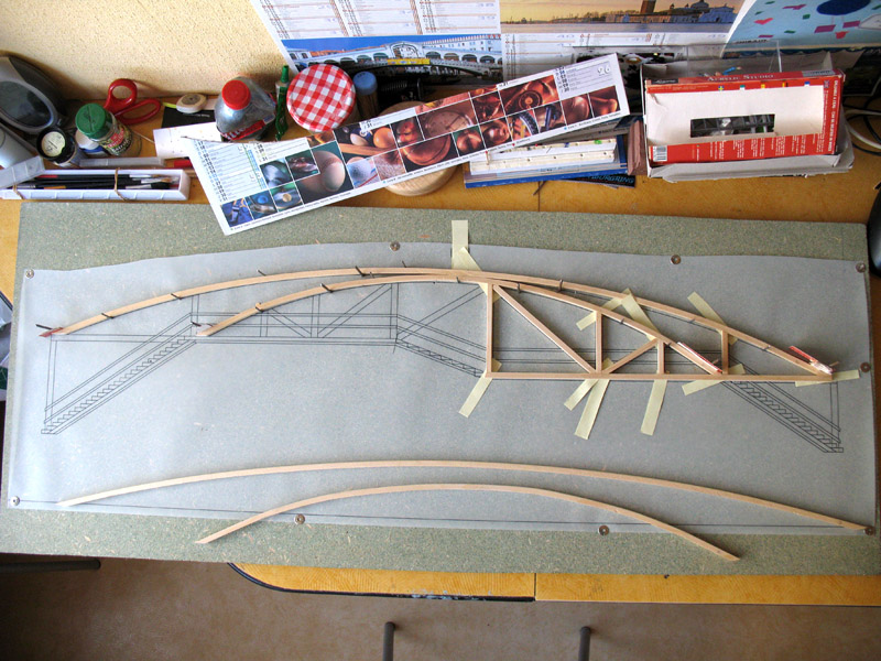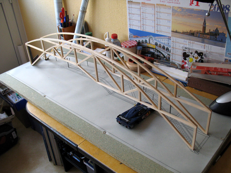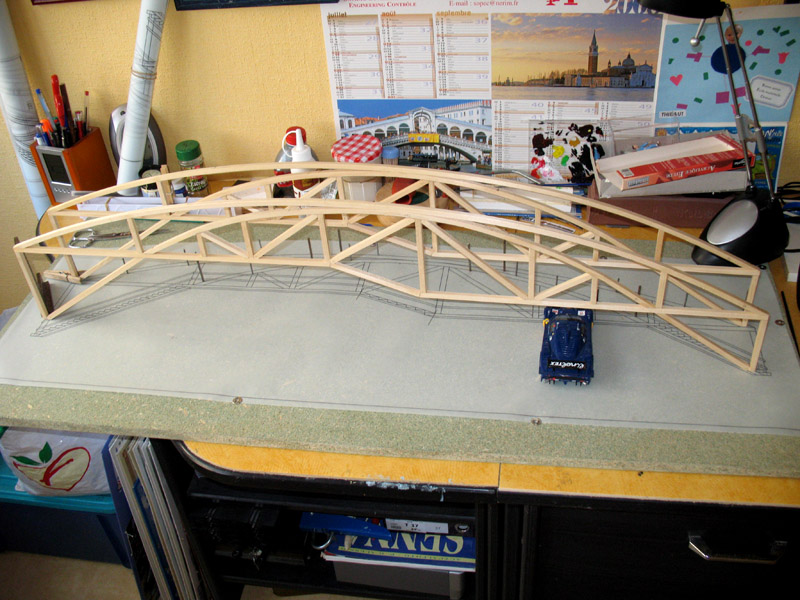 En théorie..... non, car, comme tu peux le voir, toute l'ossature est triangulée et tu le sais , qu'un triangle à cotés fixes ne se déforme pas ,contrairement à un carré ou rectangle ou l'on rajoute une diagonale ou une croix de Saint-André le seul truc à redouter, c'est la réaction au cintrage car je ne les ai pas précontraint car c'était limite dans la mise en forme et je pense que tout sera dans le collage qui devra être résistant (super glue et colle à bois) voilou Sergio