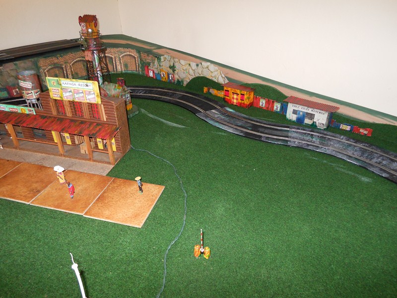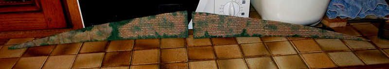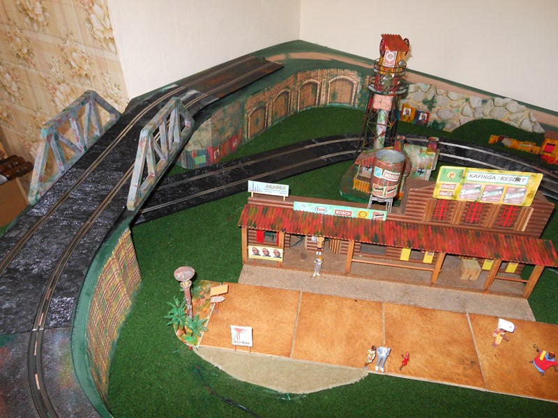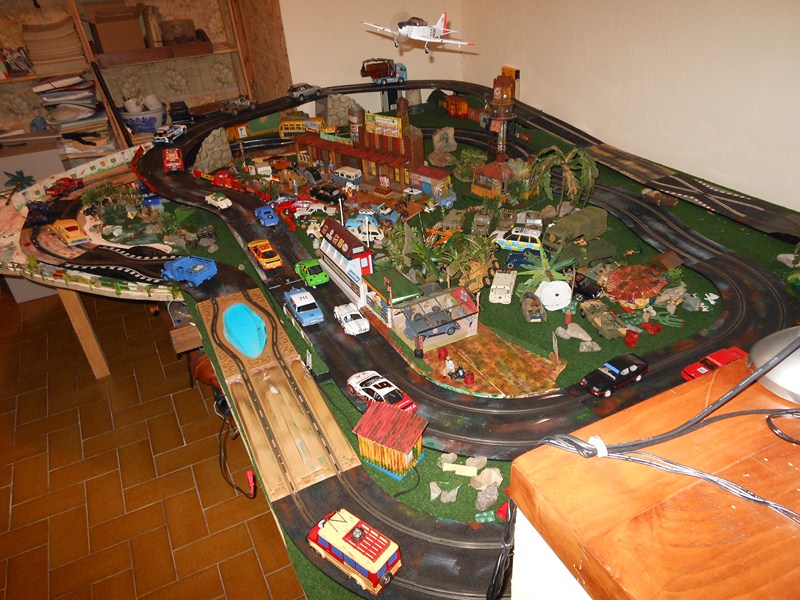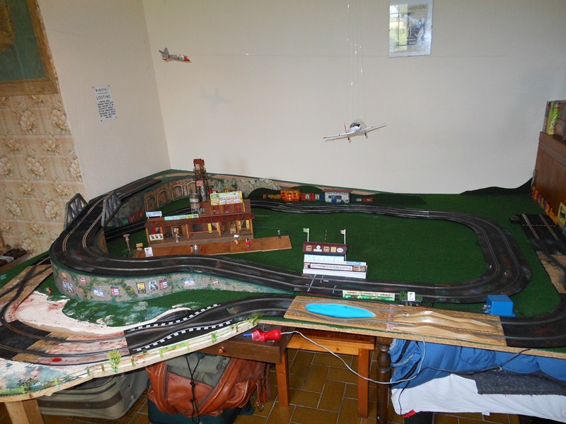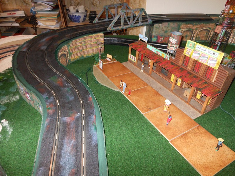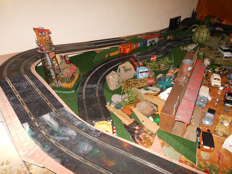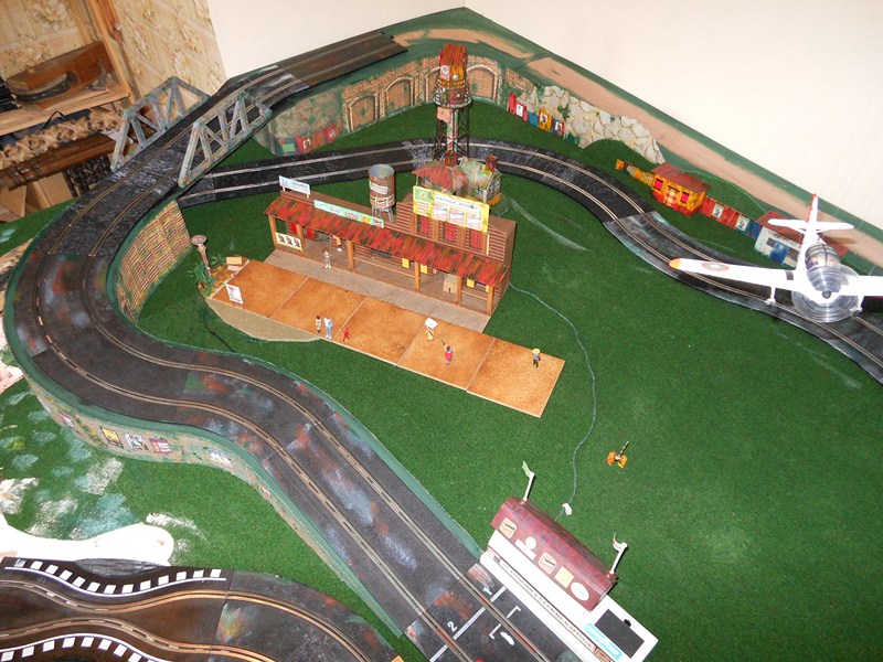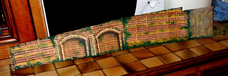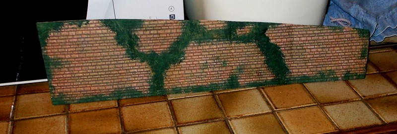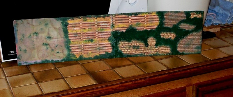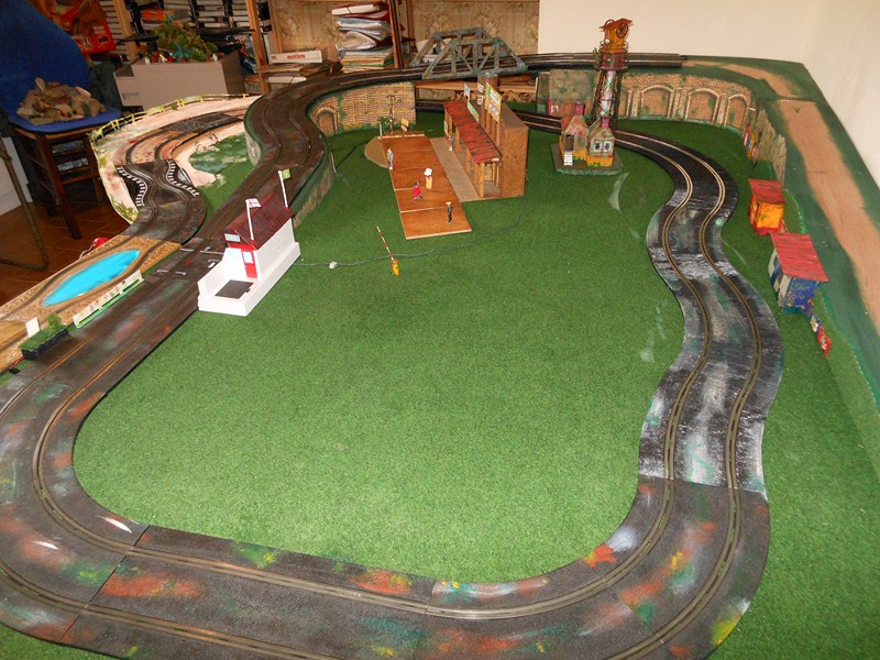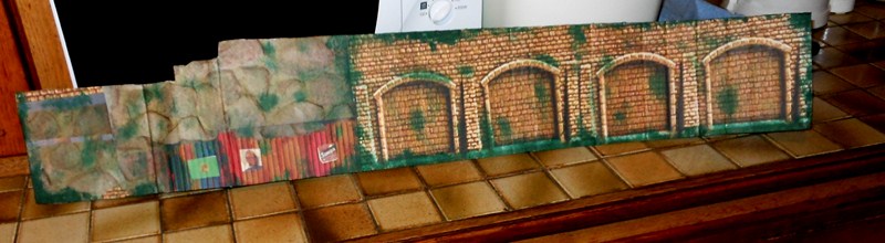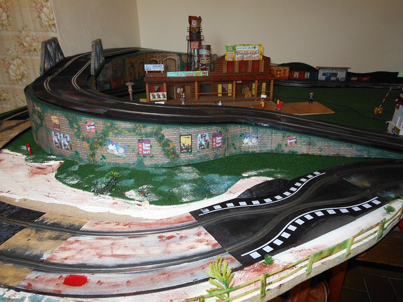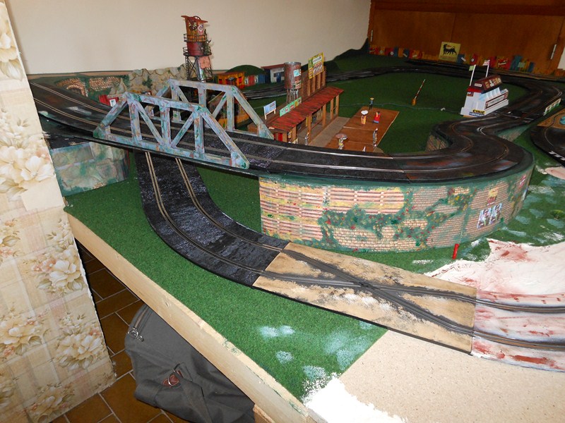 Fabrication des panneaux de côté de la partie piste surélevée faits dans du carton d' emballage, les décors sont piqués sur le web, imprimés sur feuilles A4, feuilles redécoupées, collées à la colle pour toile de fibre de verre à poser sur les murs, un peu de barbouille verte pour les jonctions.
