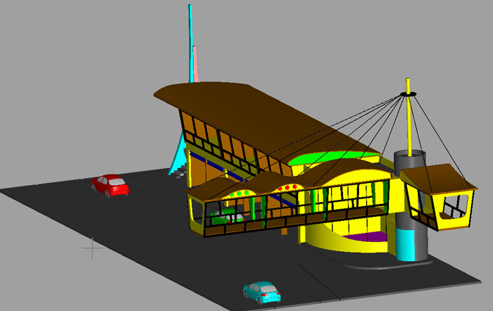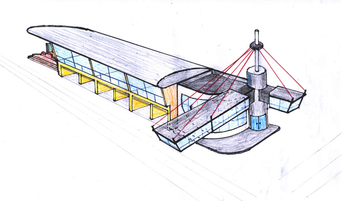 J'adore toute la partie gauche de ton dessin, surtout le toit en forme d'aile d'avion.