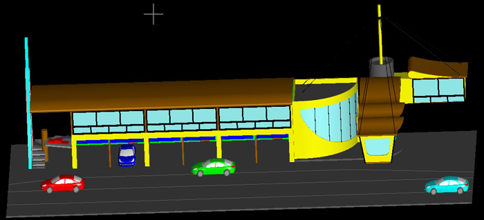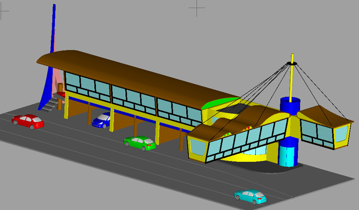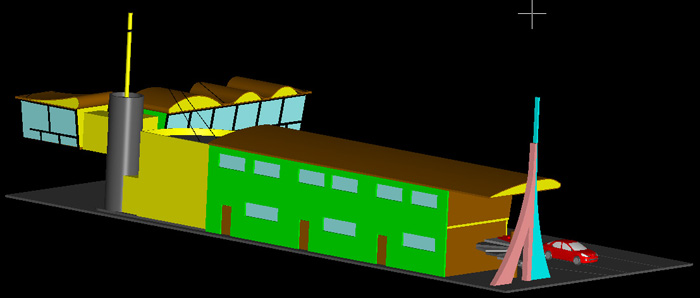 Pour répondre à takeo , le toit et le bâtiment arrondi prévu en carton ondulé, facile à mettre en forme, pour faire du bardage (peinture gris clair ou alu.)