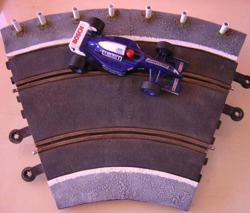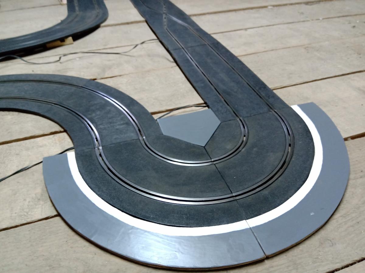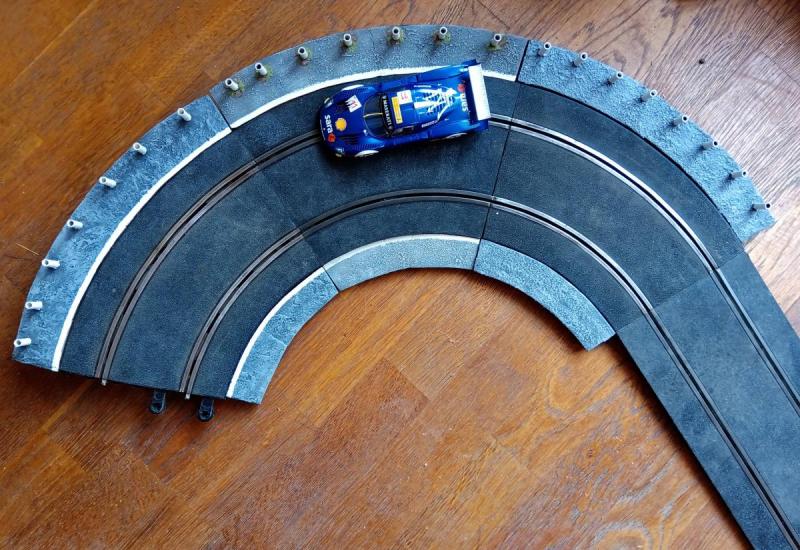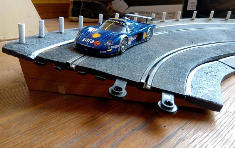 pour partager la suite de ce projet d'inclinaison en virage de ma piste de slot scalex, pas évident d'accorder les couleurs et texture de la piste entre chaque élément, quelques écarts aux jointures à régler par des cales et reste un morceau à construire plus quelques finitions.