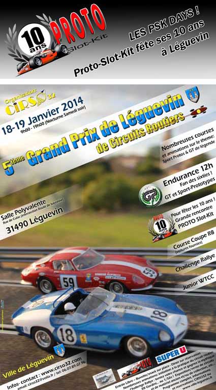PROTO SLOT KIT fêtera en 2014 l'anniversaire de 10 ANS de production. En 10 ans, ce sont une centaine de références qui ont été proposées aux amateurs de kits résine. A cette occasion, le Grand Prix de Léguevin 2014 accueillera le PSK DAY, une grande rencontre de tous les amateurs de la marque.