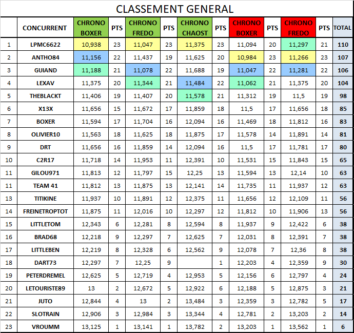 Le classement général après cette épreuve , j'ai aussi réintégré Dart73 a qui il manque juste le run de Chaostic ..