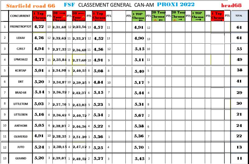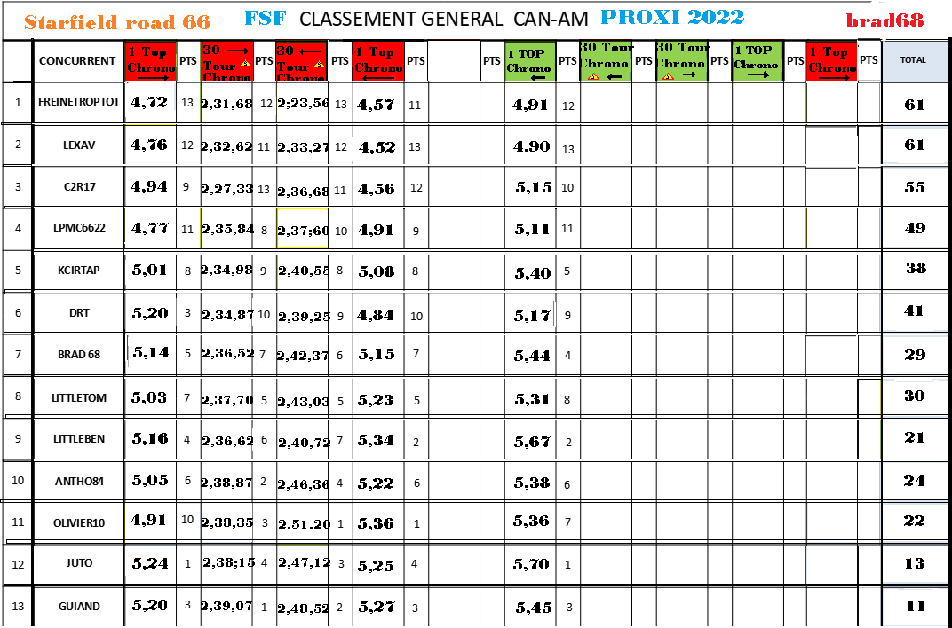 Si je peux me permette une suggestion sur l'ordre de départ, je ferais comme en rallye: l'homme en tête du classement part le 1er et nettoie la piste, puis le 2eme, etc. Ça permet au gars du fond de grille de réduire l'écart au tour.