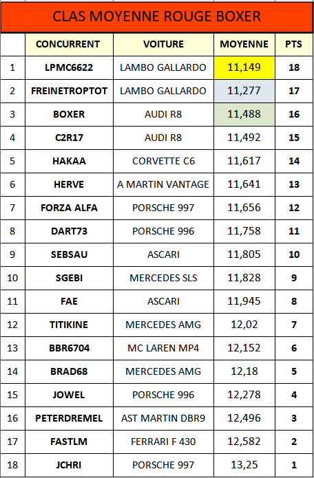 Bon, je conforte ma 12e place en prenant un tout petit peu d'avance sur Titikine, mais SGEBI et les places de devant s'éloignent... A voir comment les voitures vont se comporter sur les autres circuit, si ça va rebattre un peu les cartes, dans le bon sens pour moi...