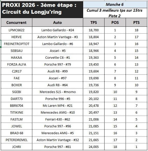 Après un rapide roulage de SchumiNi (c'est le "mini" pilote local, mon gamin de 6 ans) qui a réalisé un très honnête 6.761 avec une Ferrari 488 GT3 Sideways et un réglage poignée identique aux concurrents de la proxy, ce roulage permet de "nettoyer" le tracé et de faire un semblant de reconnaissance par rapport à la température de piste.