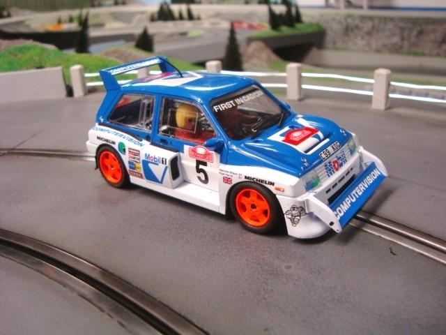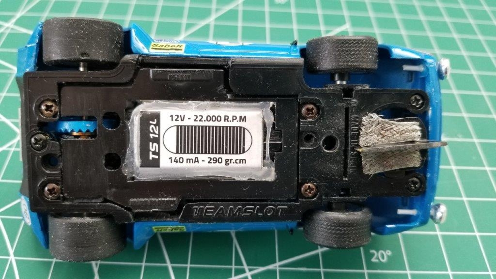 Je suis donc parti d'un kit blanc Team Slot. Châssis, berceau et moteur stock (TS12L 22k), intérieur stock TRÈÈÈÈS modifié (en fait, rien ne se montait d'origine), guide, axes et pignonnerie Slot-It, jantes CB Design avec inserts tournés d'après les jantes d'origine, 2 phares de Mini pour compléter les 6 fournis dans le kit, bleu Tamiya TS44, décalques Rallye-Miniature, là encore un peu interprétés car rien ne correspondait vraiment... 90 grammes toute mouillée, et advienne que pourra!...