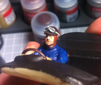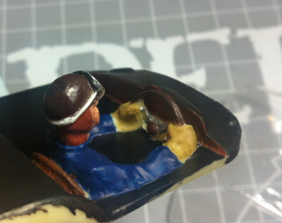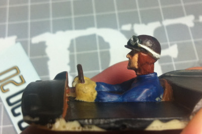 Pas évident à peindre, car le corps et le volant, indémontable, touchent le "fond"... De plus, la résine était plein de petits trous, donc le visage est marqué ! On dirait un alcoolo Bref, faut pas le regarder de trop près...
