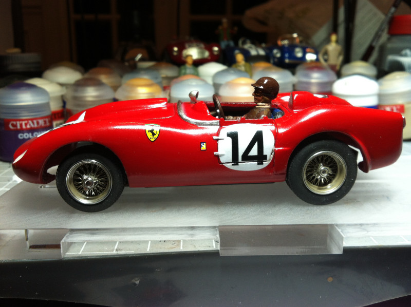 En gros, les Ferrari les plus anciennes étaient rouges très très foncé (presque marron) et la période de ta 250TR voyaient les italiennes parées d'un rouge très sang (plus foncé que le Tamiya). En évitant la couche de blanc, tu serais tombé un peu mieux.