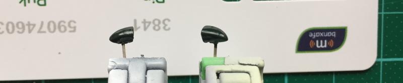 La vraie difficulté avec les rétros a été de les peindre dans une couleur aussi proche que possible de la carro. Un mélange de vert (bcp), de bleu (un peu) et de noir (à peine) m’a donné satisfaction au second essai.