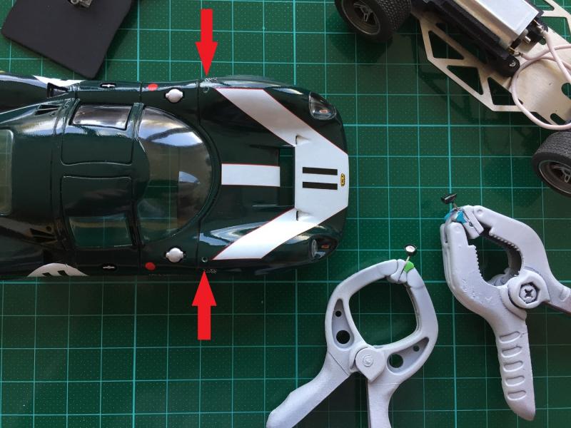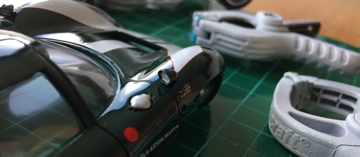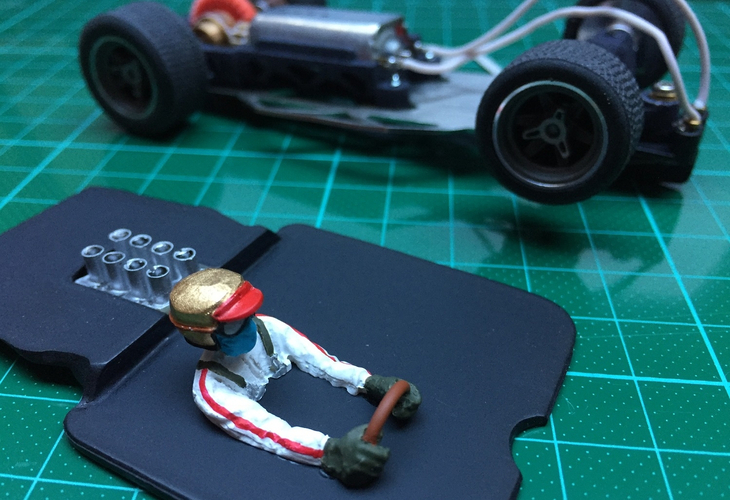 Pour ce kit, j’ai fait le choix de limiter au maximum la hauteur de caisse en rognant puis de vis, plaque du pilote (pour la faire remonter dans l’habitacle) et enfin le casque du pilote (histoire que le pilote tienne dans l’espace restreint entre sa plaque et le toit de la voiture)