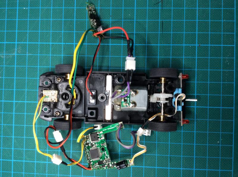 Je voulais juste vous faire partager ce que j'ai fait pour digitaliser des voitures carrera (déjà digitale) sur du scalextric. Mon problème était que d'enlever la puçe carrera rendait inutilisables les lumières des voitures. J'ai donc décider de tester les 2 puces en même temps. La cerrera qui s'occupe des phares et la scalextric qui s'occupe du moteur et des changements de voies. Ça marche super. Je vous mets un petite photo du montage. Dans cet exemple il ne reste pas beaucoup de place !!!!