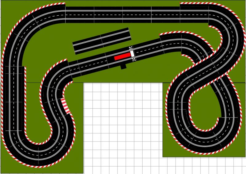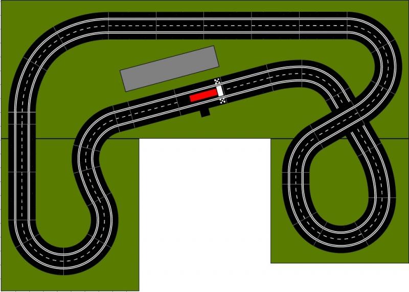 La ligne droite serait idéalement en descente pour que l'épingle se trouve à plat ainsi que l'endroit ou placer la powerbase. J'ai sacrifié de l'espace plateau pour permettre une déco de stand d'arrière plan (un peu plus de 20 cm voie de pit incluse)