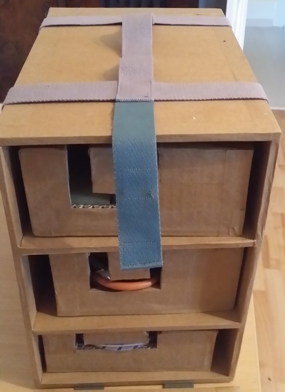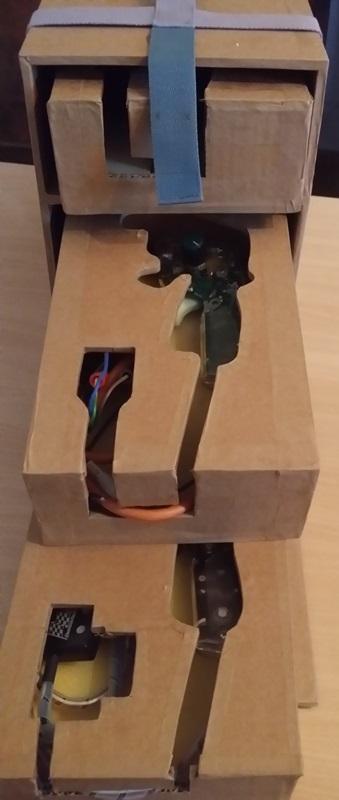 Mais pourquoi a-t-elle découpée le devant des boîtes pour faire passer les fils, et non pas seulement le dessus? Justement pour que le fil apparaisse et que tu saches quelle poignée est dans quelle boîte? ![]()