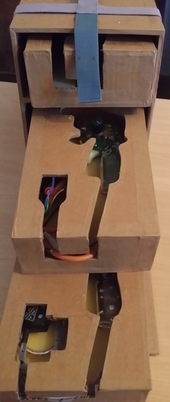 Mais pourquoi a-t-elle découpée le devant des boîtes pour faire passer les fils, et non pas seulement le dessus? Justement pour que le fil apparaisse et que tu saches quelle poignée est dans quelle boîte?