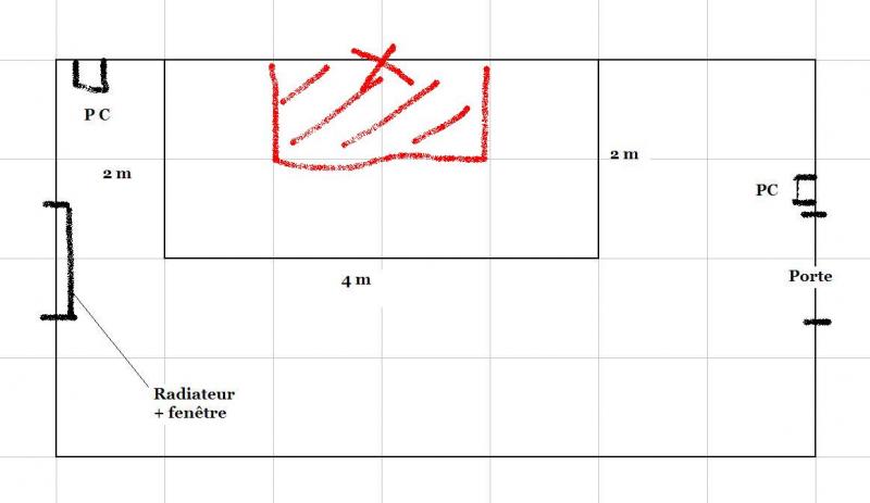 Je vais essayer d'être plus précis désolé. Je pars du principe que la planche est fixe. Je ne peux pas la coller dans un angle à cause de la tuyauterie du radiateur dans le fond de la pièce, partie gauche sur mon dessin. Je fais avec les moyens du bord au boulot pour le croquis ...