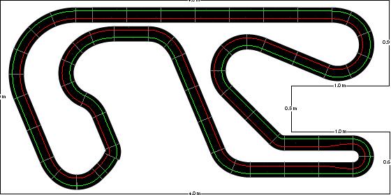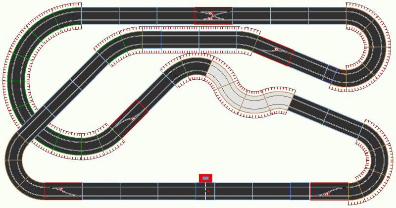 Nota : La ligne droite du bas de mon dessin était à priori destinée à recevoir une pit-lane de stand dans le cadre d'un circuit 'digital'. En cas de digitalisation, ce serait dommage de voir cette partie 'attractive' du circuit reléguée du côté du mur : prévoir donc un peu de place de l'autre côté en profitant du moindre encombrement de la piste Scalextric.
