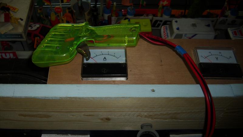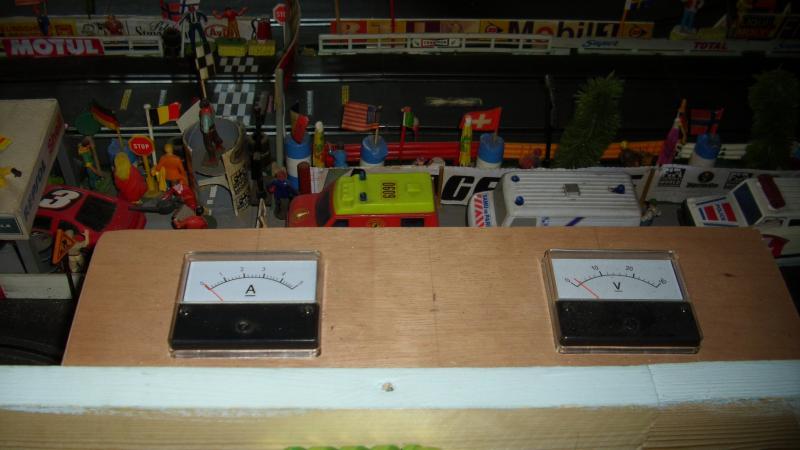 - alimentation par une grosse alim stabilisée 12v 20a 22 a maxi ( on peut mettre plusieurs auto a la suite ca ne débite que proportionnellement pbm j'ai grillé mes gros transistors vu de derriere il y en a un ou 2 en plus dedans je l'ai depanné moi meme pour peu cher en les changeant tout simplement ( ca ne vaut pas cher moins de 1e piece ) c'est souvent ca dans toutes les alimentations stabilisées j'ai changé aussi un petit ci régulateur de tension a l'interieur a tout hasard mais c'était bien ces gros transistor ca m'est arrivé parce que les voitures se mettant en court circuit via les balais j'ai du avoir une forte intensité de court circuit ! donc retour d'experience si sa vous arrive n'hésitez pas a faire la méme réparation j'ai mis un petit fusible en sortie comme ca il protege l'ensemble bien qu'il en possede un en interne je pense mettre une diode ou 2 pour proteger en cas surtension ou inverson polarités ( les spécialistes pourront me dire comment faire au mieux !) ... le cablage est réalisé avec du gros fil souple pour enceintes hifi de 2.5mm2 d'où moins de resistance et de pertes aux voitures j'ai eu les vu-métres sur internet eBay ou leboncoin pour 2 fois moins cher qu'en boutique ... c'est impeccable pour voire les caractéristiques de chaque auto la sortie elle aussi est en 2.5mm2 jusqu'à l'alimentation du circuit j'envisage de mettre 2 leds de couleurs différentes ou voyants 12v pour visualiser presence tension chaque piste