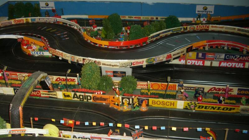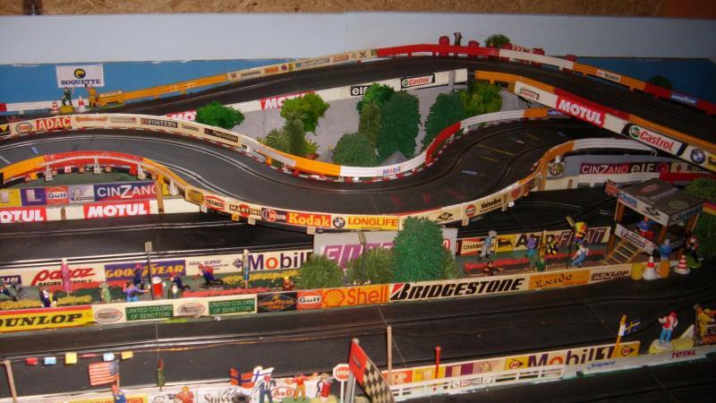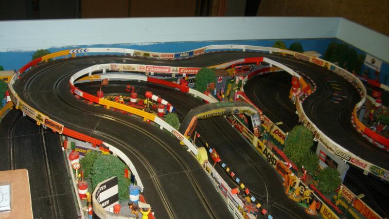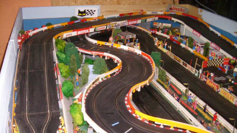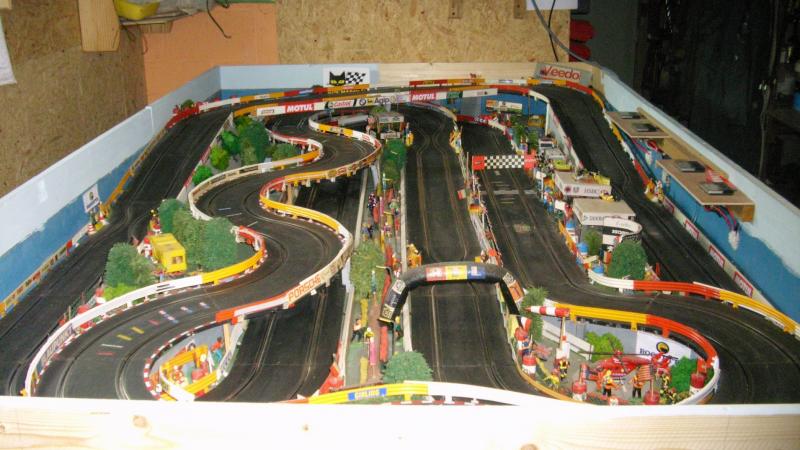 voici des photo de ma piste a modifier ! les 2 longues montées sur les cotés ne sont pas regulieres ! la partie suspendue en " s" demanderait un nouveau support en bois 8 a 10mm plus large et realisation de pont bien plus stables et surtout de niveau car j'ai des deslotage j'envisage de refaire des parties de rails cassées ou fendues a la époxy bicomposant aussi et de remplacer certains rails dont les parties metaliques se soulevent et engendre des butées pour les guides j'envisage aussi de nouvelles barrières a partires de moulures plastique de 2.50m vues en menuseries chez le roi ...du bricolage ainsi que de realiser des bordures en plaque mousse de chez brico a 5mm epaisseur rayon papier peint ... du boulot en perspective