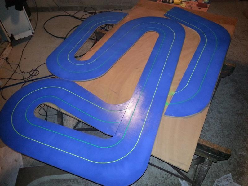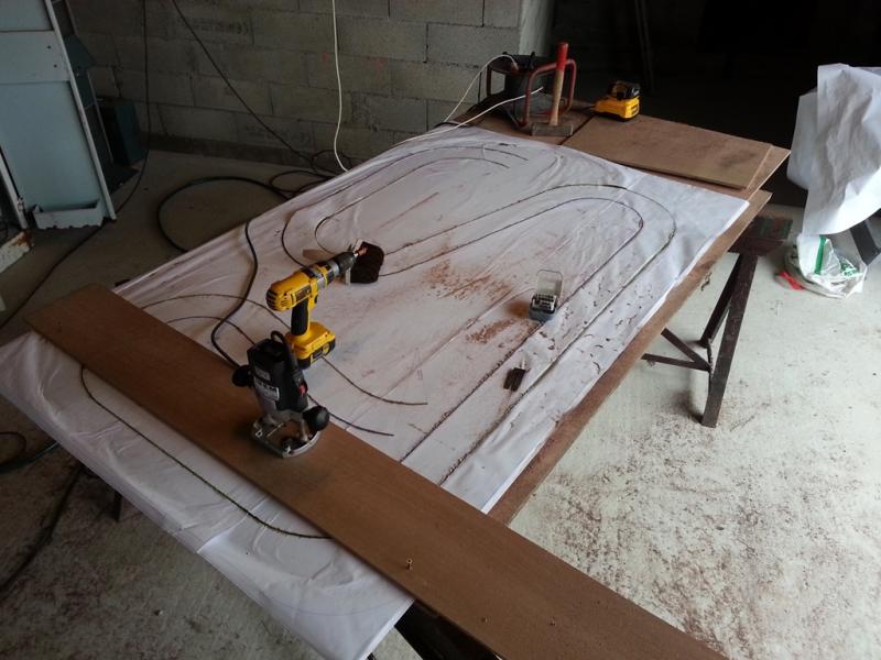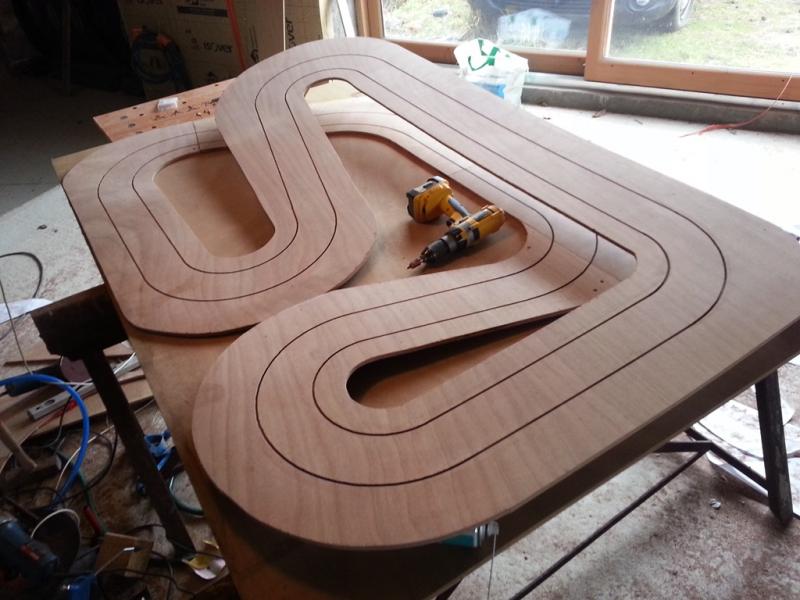 Je suis parti sur une base de circuit bois, plateau de 123 x 195 en contreplaqué..est-ce que ce matériaux peut convenir ? J'ai deux plateau de la même taille, l'un fait 15mm d'épaisseur, l'autre 10. Je vais faire des slot de 4mm par 10 de profond. J'ai espacé les voies de 10 cm entre elles, et 5cm du bord de piste.