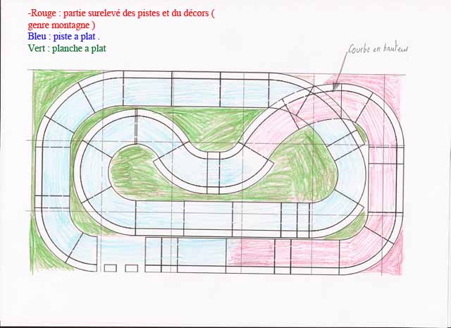 je sais pas si on verra bien ou pas, alors je vous dis les légendes ...-rouge :les rails que je voudrais mettre en hauteur ( je pense a 10 cm ).
