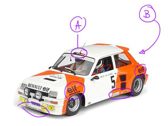 Merci MATT pour la photo, c'est exactement ce que je cherchais. Pour les décals c'est super sympa mais les seuls dont j'ai besoin semblent être déjà sur la voiture en sortie de boite (les sponsors entourés sur la photo ci-joint). Par contre je vais abuser encore un peu; une petite photo de la plaque au dessus du parebrise (A) et une de l'arrière (B)........ça serait top !