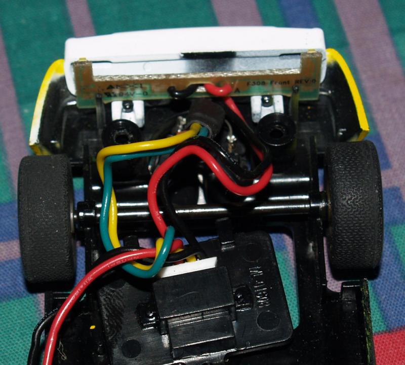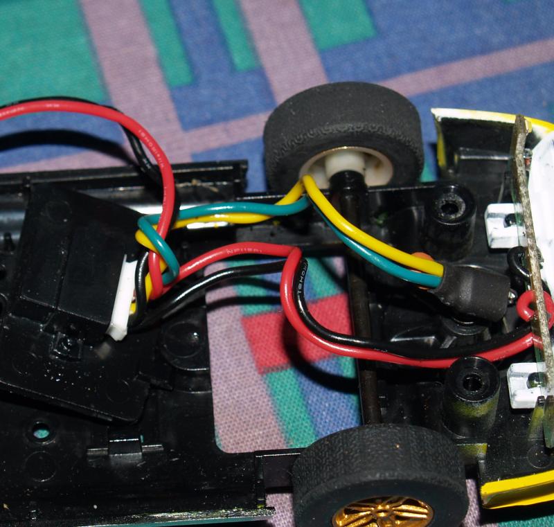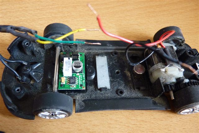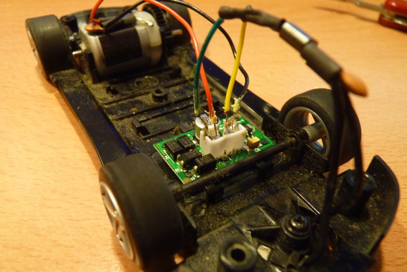 Ou bien tu poses la voiture sur la demi droite de la base, tu soulèves un peu l'arrière, et tu accélère, tu regardes dans quel sens tournent les roues pour voir si tu n'a pas inversé les fils,