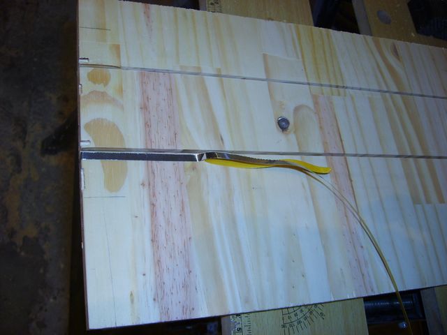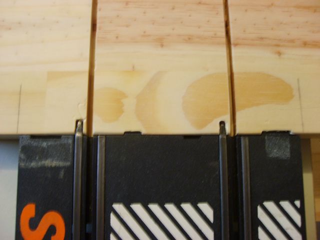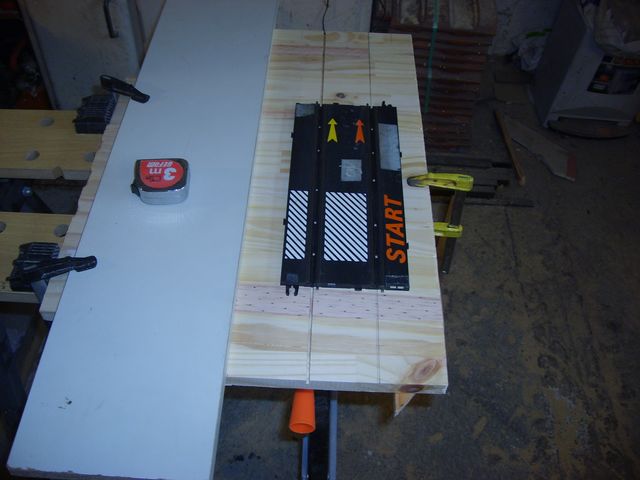 Bon allez hop c'est parti avec une chute de panneau en pin de 600mm. ca tombe bien mes rails font 300mm de long donc j'ai pile un double droit.