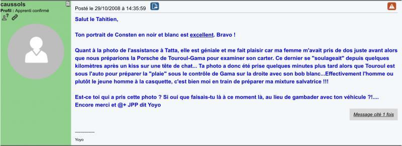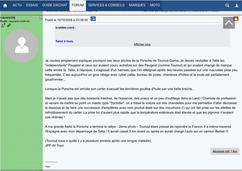 Si Jean kerguen a mené sa bête de course à la troisième marche du podium, Raymond Touroul n’en a pas moins démérité avec sa petite 911 vraisemblablement pas de toute première fraîcheur, puisque il l’a porte à la 5 eme place!