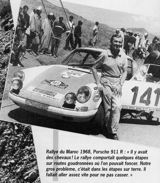 Présentons nos pilotes,Honneur au plus célèbre des deux, Raymond touroul, pilote émérite et porschiste convaincu des années 70 à 90, il a écumé nombre d’épreuves, passant brillamment du mans au tour de France sans oublier quelques rallyes ou criterium. Il courra le Maroc à plusieurs reprises, 1971 sera une de ses courses les plus méritoires.
