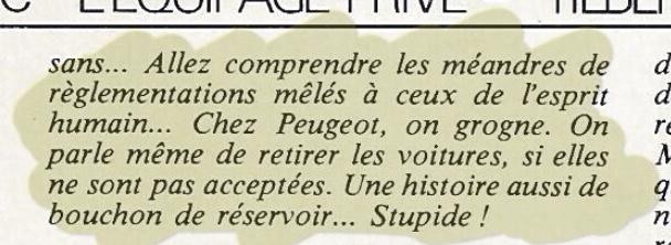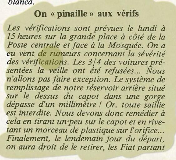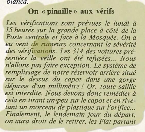 soucieux de bien faire, et surtout de bien se faire voir dans les bureaux feutrés des maîtres du sport auto, nos gentils organisateurs brilleront par trop d’excès de zèle lors des verifs, ils seront très tatillons et refuseront beaucoup de voitures, souvent pour 1 mm ou une peccadille. c’est agaçant, très agaçant même, la tension est palpable auprès des concurrents, surtout chez les usines qui ne sont pas là pour enfiler des perles. Peugeot menace même de se retirer! C’est pas terrible de se mettre à dos un constructeur influent! On lâche un peu de pression et on laisse couler. C’est pas le meilleur moment pour faire sa sucrée.