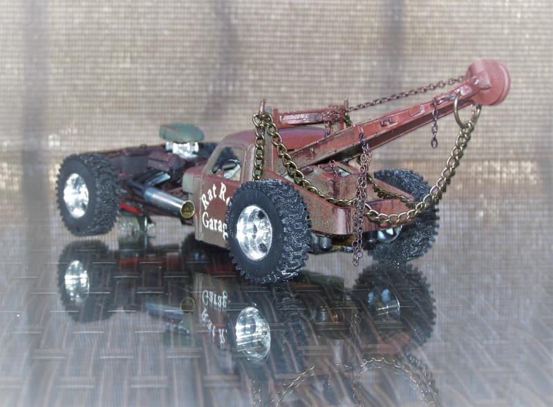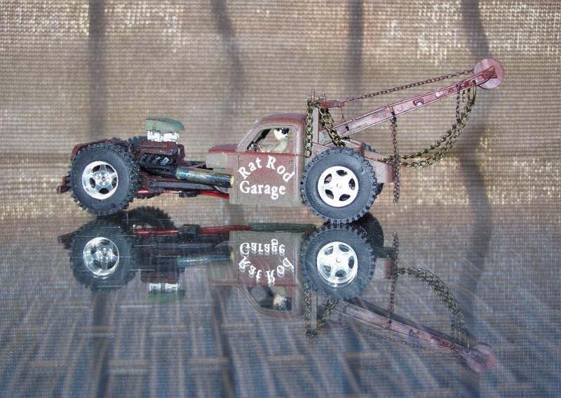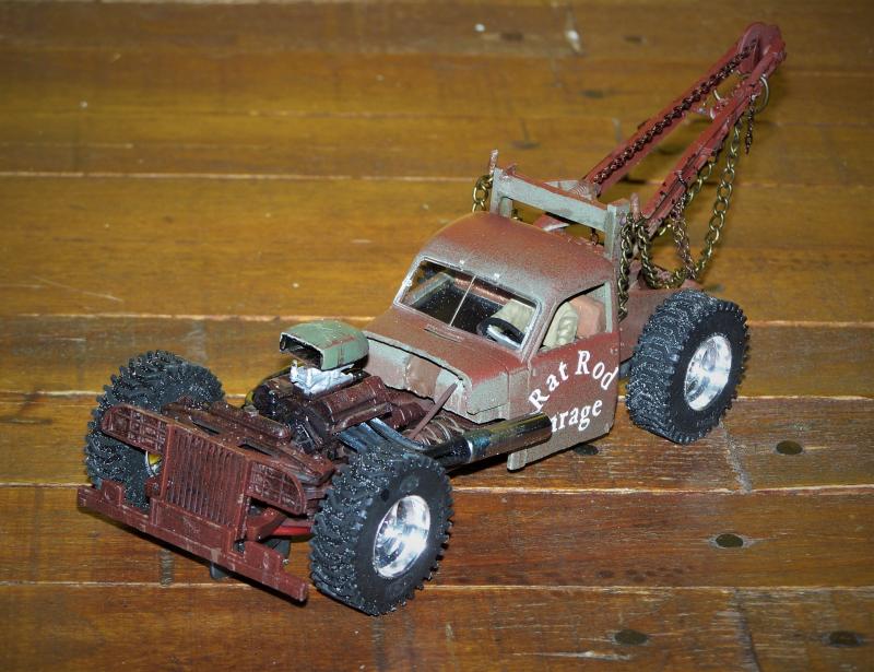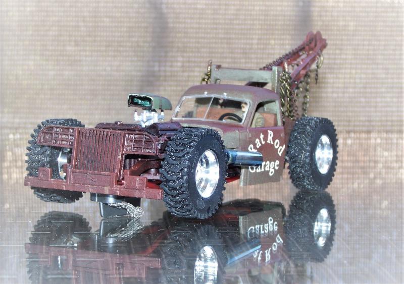 Pour faire court, le châssis avant est fait sur la base de la Lincon dont j'ai repris le moteur fictif amélioré avec deux gros carbus un "scoop" pour aspirer l'air et des échappements fait maison avec du jonc en laiton et une antenne radio. la cabine et la calandre proviennent du kit ICM, la grue est faite maison avec les ailes avant du truck et des morceaux de sont châssis.