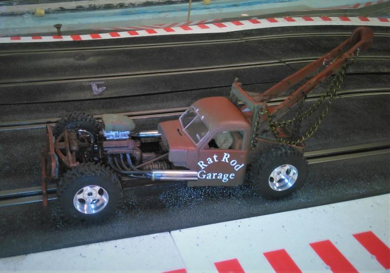 L'inscription : Rat Rod Garage est peinte, fond blanc masqué avec des lettres adhésives, puis peinture à la bombe verte et enfin rouille,en prenant soin de retirer le masquage une fois la peinture sèche.