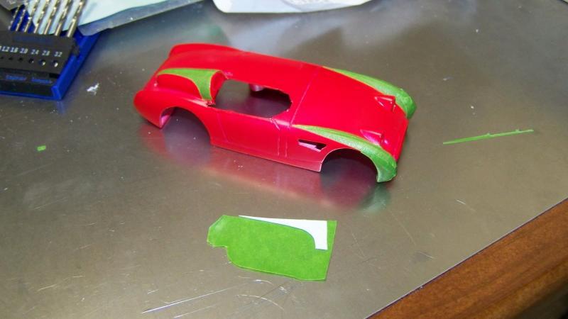 Etape suivante, le masquage. Sur la photo ci-dessous, on aperçoit un des gabarits qui ont servis à couper les adhésifs de masquage.