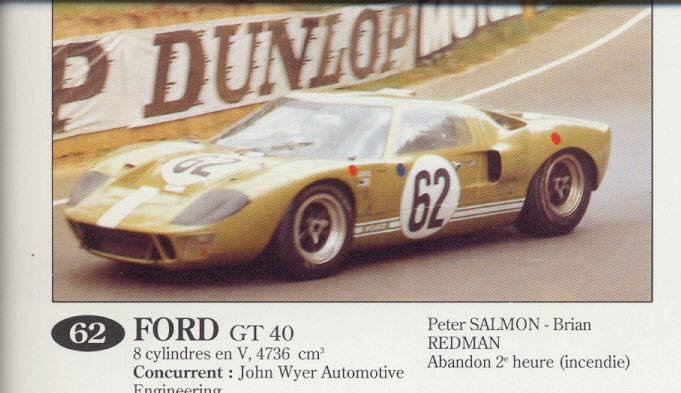 Je recherche des photos de la Ford GT 40 n° 62 du John Wyer Automotive Engine pilotée par Mike Salmon/Brian Redman au Mans 1967. Merci de votre aide.