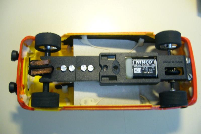 Après une petite bidouille pour rallonger le chassis slot classic (utilisation des 2 parties avant livrées avec le chassis), l'empattement est bon. Pour le reste, train roulant et moteur ninco NC1, jantes Alu NINCO (j'aimais bien le dessin qui rappelle les jantes de R5 alpine)
