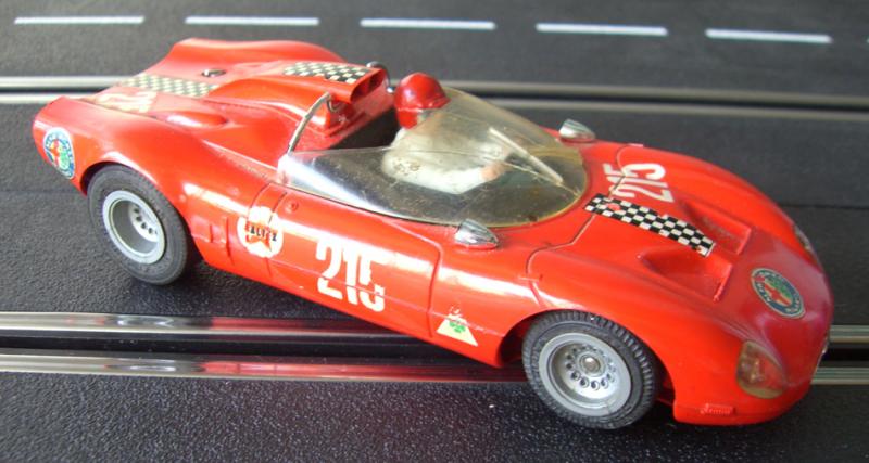 Par un gros hasard, je me suis trouvé une vraie petite merveille dans une brocante près de St Raphael au mois de septembre. Plutôt rare en bon état, c’est une Fleischmann à l’échelle 1/32 et il s’agit d’une Alfa Romeo P33/2 « Périscope » de 1967 avec sa décoration des 24 heures de Daytona 1966-67. Elle est dans un état impeccable, à part une felure dans le pare-brise, et la carrosserie n’a aucune rayure. Les chromes sont un peu usés mais elle est absolument complète et semble être relativement saine du point de vue mécanique et moteur.