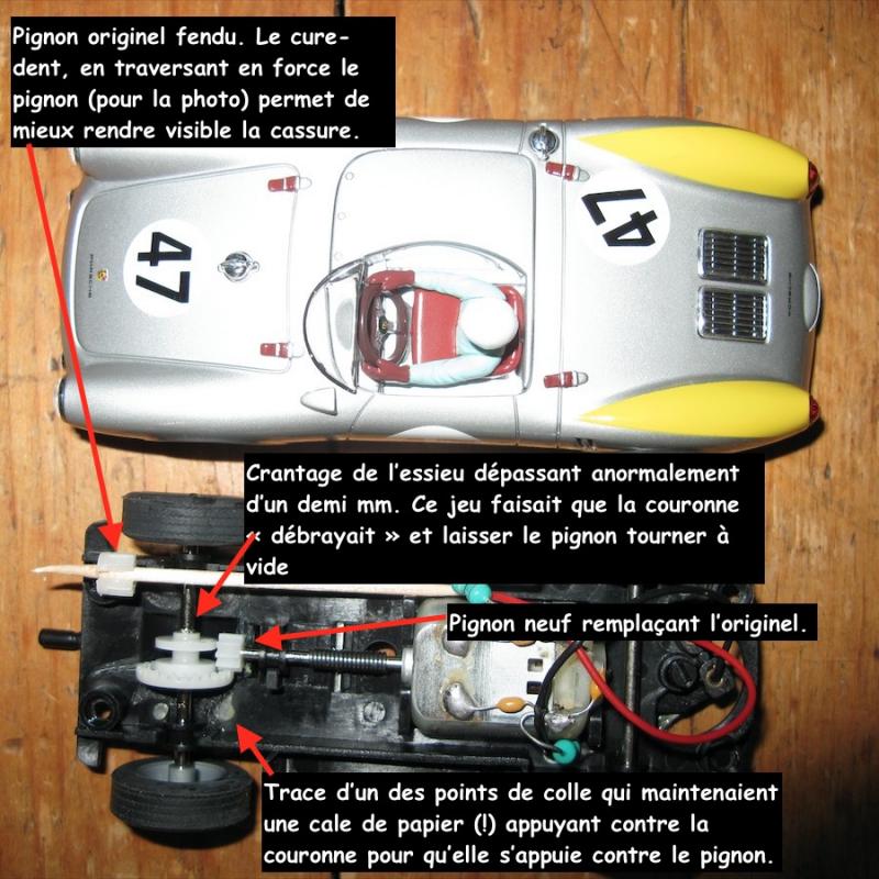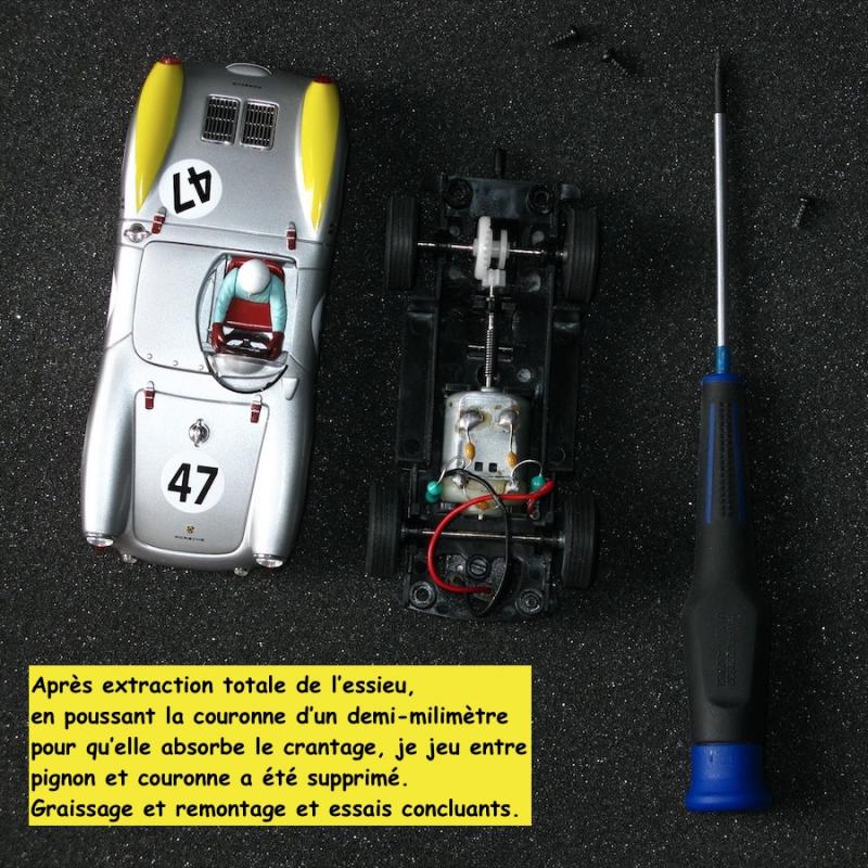 Le montage final de la Porsche de 1954 a dû être corrigé : couronne d'engrenage mal positionnée et pignon cassé. Ça me fait penser à une de mes vertèbres. Pareil. Elle débrayait. On a monté une sorte de greffe... Elle datait (la vertèbre de 1953). Même chose pour une dent. Une couronne qui bouge quand je croque des pignons.