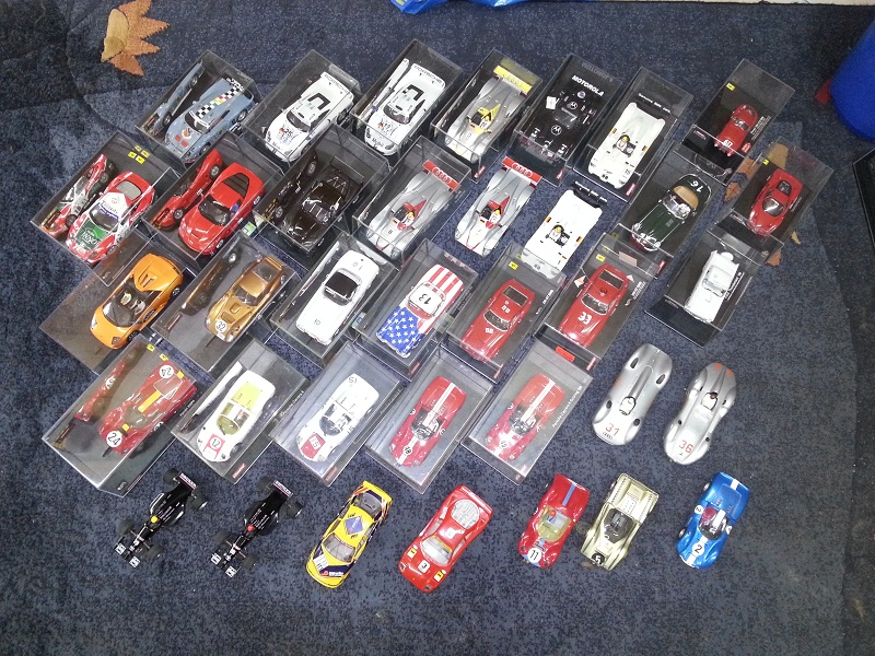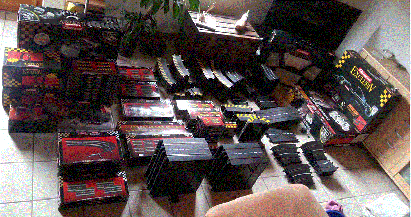 Il m'a fallu pas mal d'heures pour nettoyer, trier, répertorier toutes ces pièces. Courbes, droites, pont, loopings, barrières, manettes, voitures, accastillage, boîtes vides et/ou pleines, de la doc et d'anciens catalogues etc.