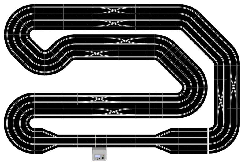 pouvez vous me proposez un tracé en scalex digital en 4 voies avec rétrécissement en 2 voies pour placer ma pb sur une place de 3m sur 2m avec 1 voie de stand et je prefererai sans pont