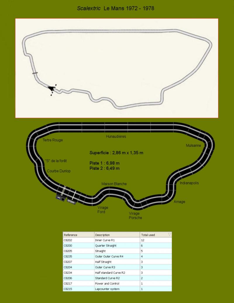 Il s'agit du circuit utilisé entre 1972 et 1978 mais avec la zone de Maison Blanche très simplifiée en raison de la superficie réduite. Les références sont en Scalextric Sport.