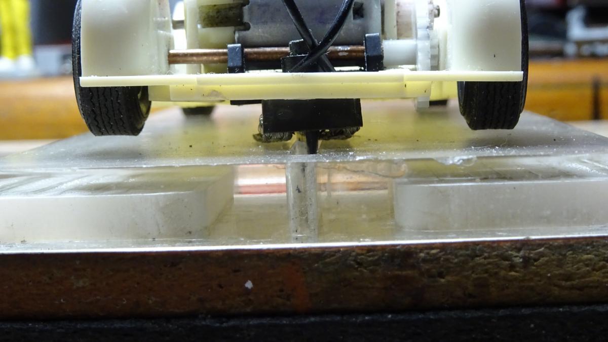 Ce bras doit être d'un poids conséquent genre une plaque de laiton pour assurer le contact sans que le mouvement des roues motrices avant ne l'influence.
